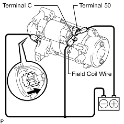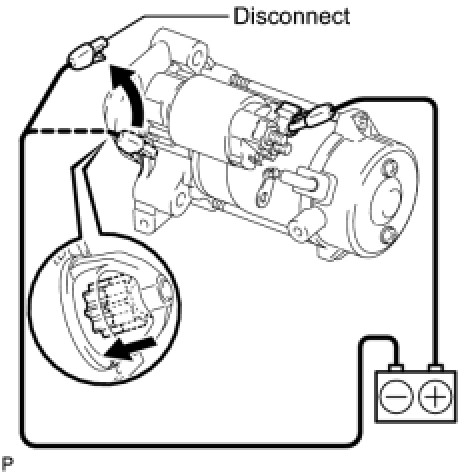 (1) Disconnect the negative (-) terminal lead from terminal C with the condition specified in the pull-in test above being maintained. Check that the pinion gear remains out.
