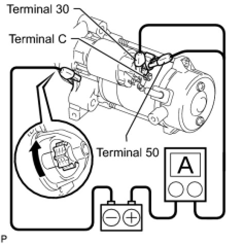 (3) Connect the battery and an ammeter to the starter as shown in the illustration.