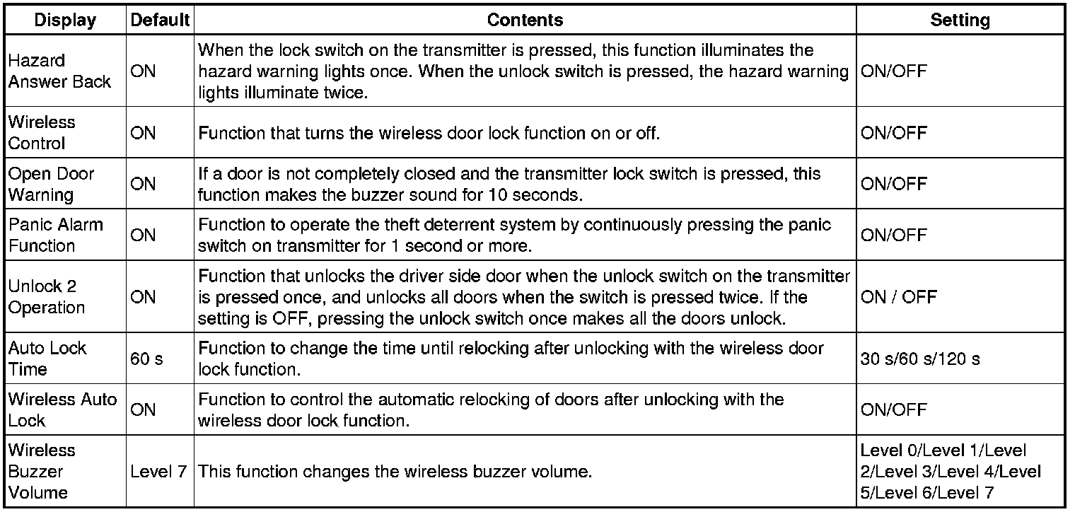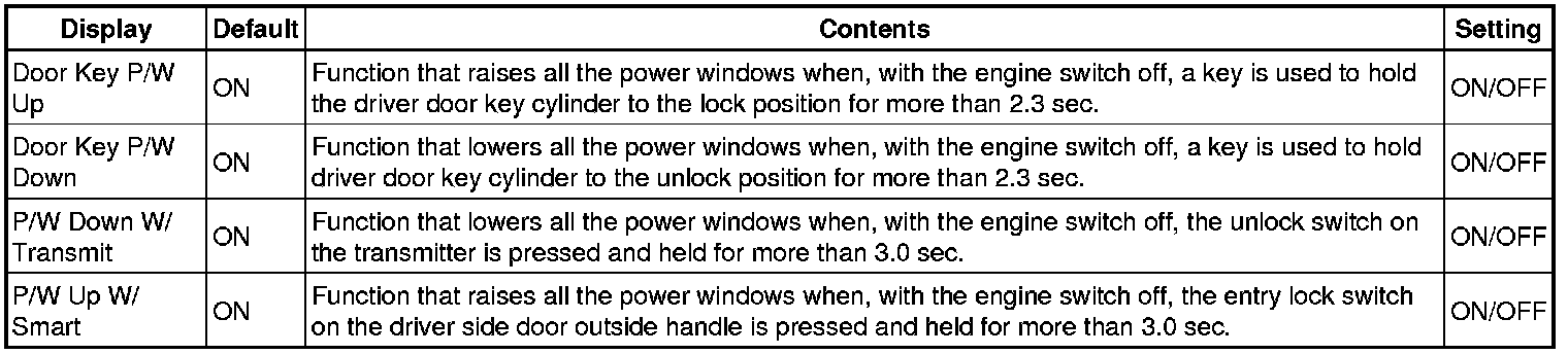 - When the switches are pressed and held for 5 seconds, the entry door unlock mode changes in the following order: driver door unlock mode, all door unlock mode.
