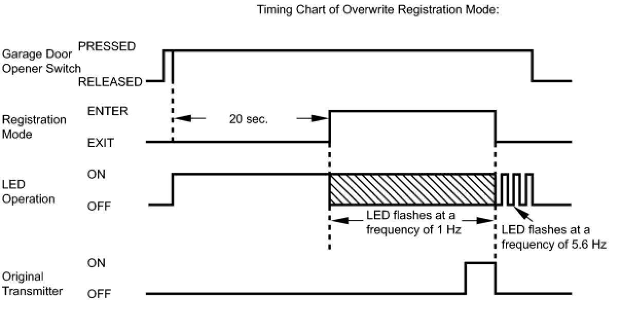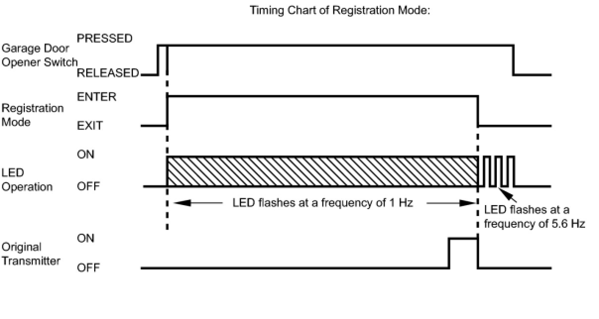 4 If the transmitter code registration was successful, the LED of the garage door opener flashes at a frequency of 5.6 Hz, and the overwriting completes. If no malfunction occurs, release both the garage door opener switch and the original transmitter switch.