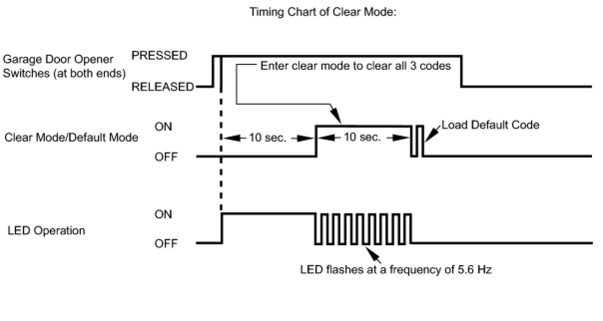 1 Press and hold the left and right switches at both ends of the garage door opener for 10 seconds. The LED will flash at a frequency of 5.6 Hz, and clearing is completed. Releasing the switches will end clear mode.