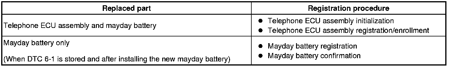 If the "MAYDAY BATTERY REGISTRATION BUTTON SEQUENCE" has not been completed correctly, DTC 6-1 remains stored even if the mayday battery is replaced with a new one. In this case, check to be sure the old battery is removed and the new battery is installed. Then perform the "MAYDAY BATTERY REGISTRATION BUTTON SEQUENCE" again.