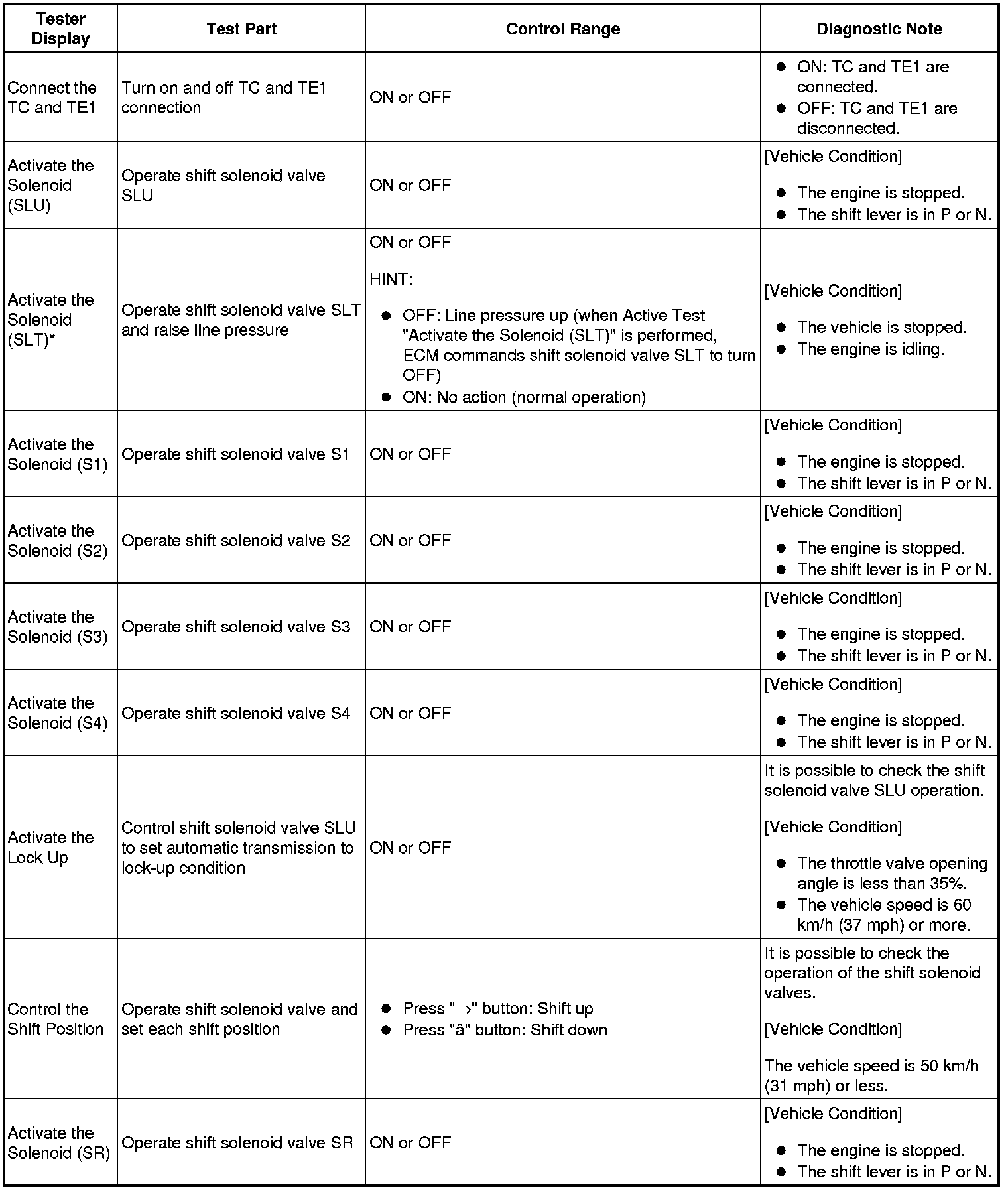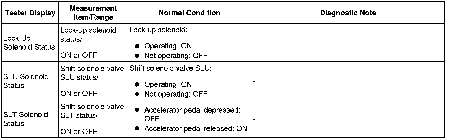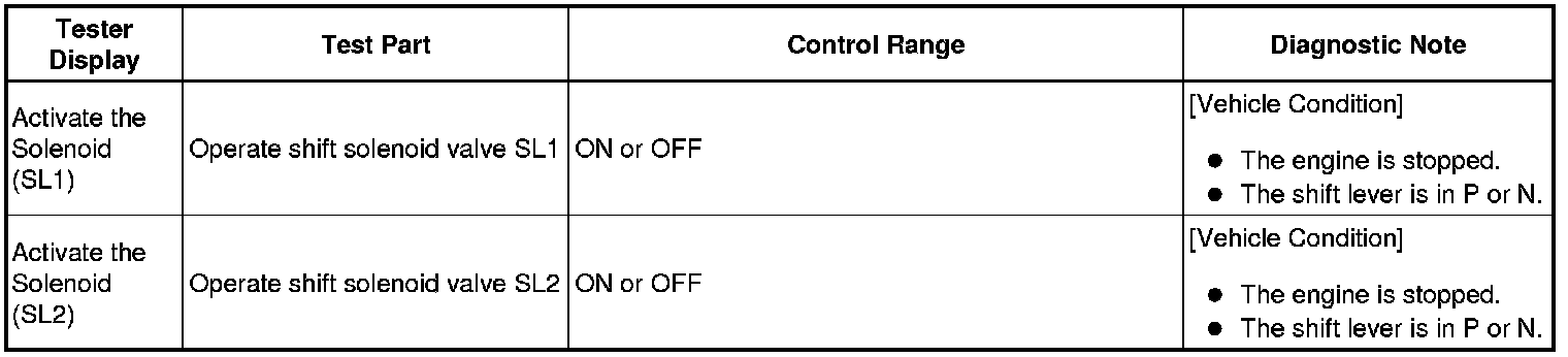 HINT: *: Activate the Solenoid (SLT) in the Active Test is performed to check the line pressure changes by connecting SST to the automatic transmission, which is used in the Hydraulic Test Hydraulic Test as well. Note that the pressure values in the Active Test and hydraulic test are different.