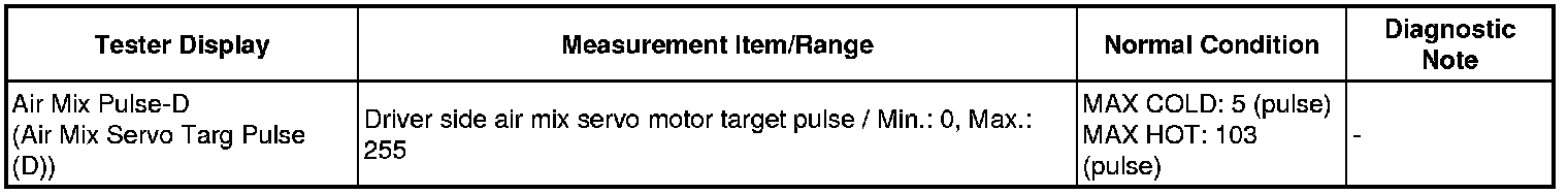 The air mix damper servo sends pulse signals to inform the air conditioning amplifier of the damper position. The air conditioning amplifier activates the motor (normal, reverse) based on the signals to move the air mix damper (driver seat) to any position. As a result, the amount of air passing through the heater core after passing through the evaporator is adjusted, and the temperature of the air blowing toward the driver seat side is controlled.