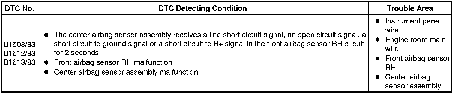 These DTCs are stored when a malfunction is detected in the front airbag sensor RH circuit.