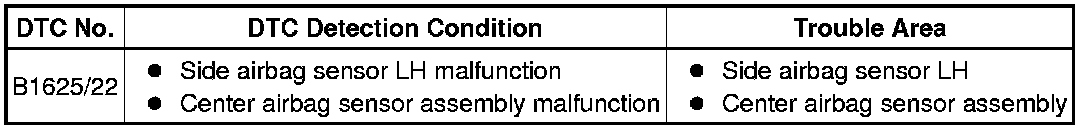 DTC B1625/22 is stored when a malfunction is detected in the side airbag sensor LH circuit.