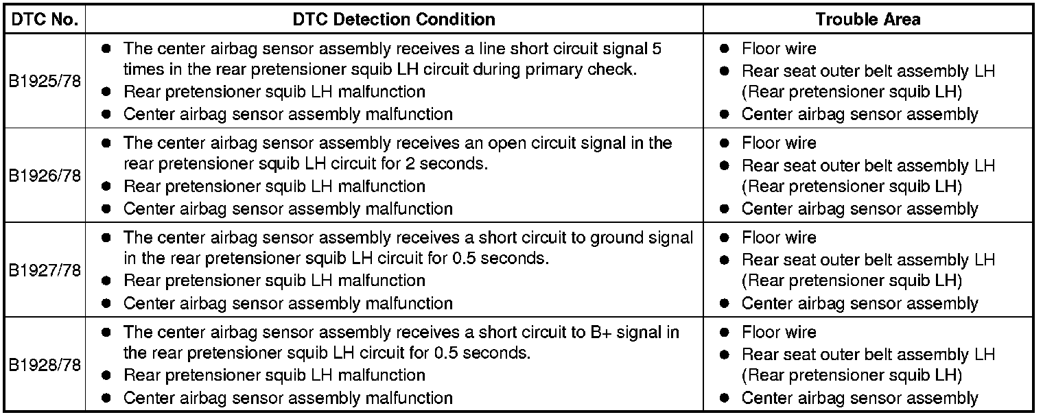 These DTCs are stored when a malfunction is detected in the rear pretensioner squib LH circuit.