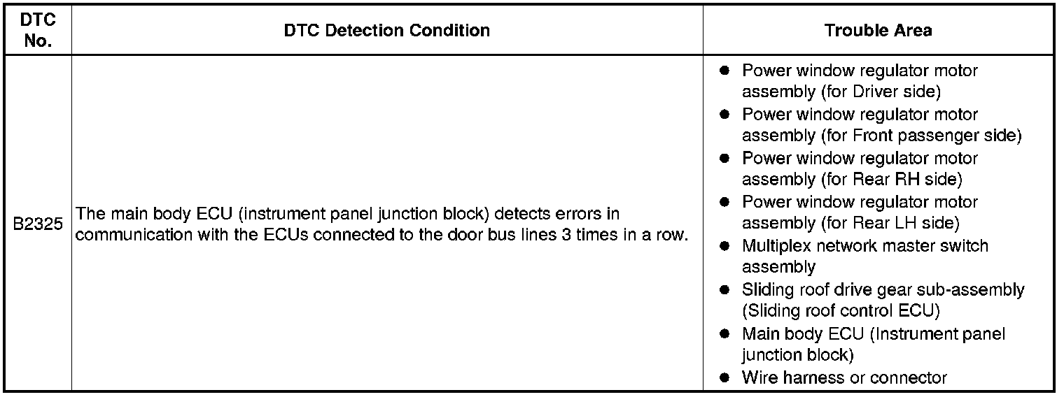 The main body ECU (instrument panel junction block) monitors communication between all the ECUs connected to the door bus lines. When the main body ECU (instrument panel junction block) detects errors in communication with all the ECUs connected to the door bus lines at 2.6-second intervals and 3 times in a row, DTC B2325 will be stored.