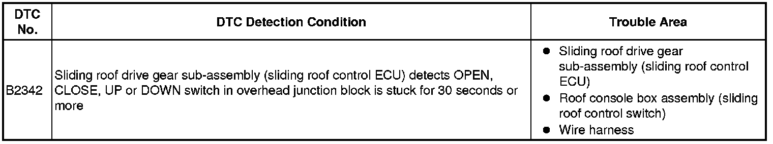 This DTC is output when the sliding roof drive gear sub-assembly (sliding roof control ECU) detects that the OPEN, CLOSE, UP or DOWN switch in the roof console box assembly (sliding roof control switch) is stuck for 30 seconds or more.