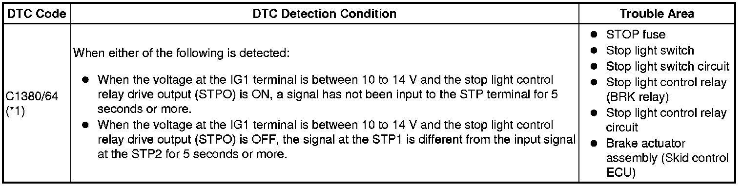 BRAKE CONTROL: VEHICLE STABILITY CONTROL SYSTEM: C1380/64: Stop Light Control Relay Malfunction