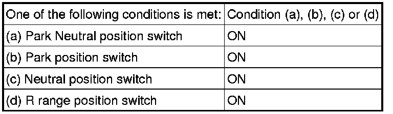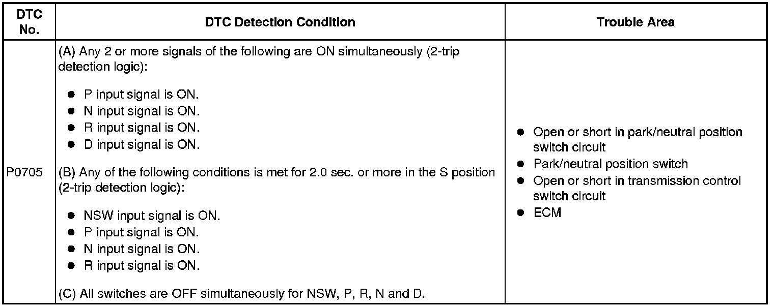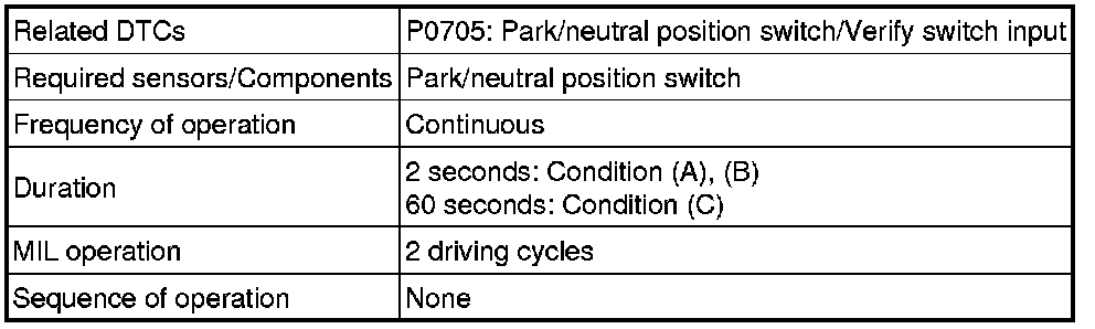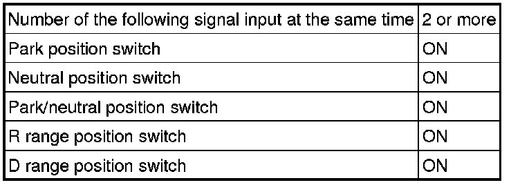 The park/neutral position switch sends a signal to the ECM according to the shift position (P, R, N or D). The ECM determines that there is a problem with the switch or related parts if it receives more than 1 position signal simultaneously. The ECM will turn on the MIL and store the DTC.