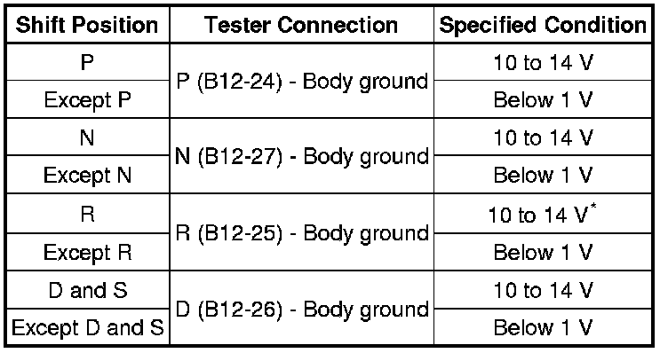 (b) Turn the engine switch on (IG), and measure the voltage according to the value(s) in the table below when the shift lever is moved to each position.