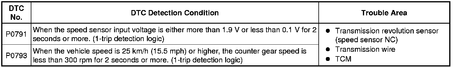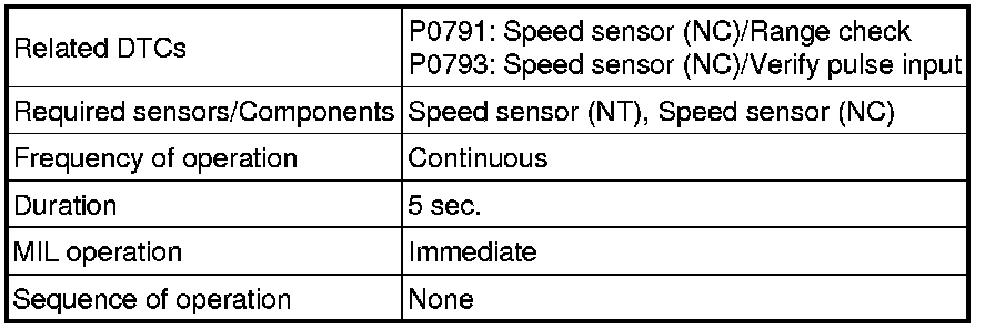 The NT terminal of the TCM detects a revolution signal from the speed sensor (NT) (input RPM). The TCM calculates a gearshift comparing the speed sensor (NT) with the speed sensor (NC).