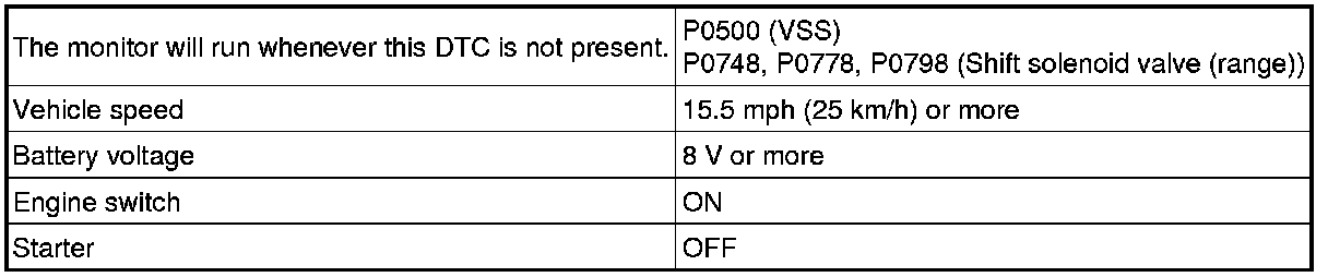 While the vehicle is operating in 2nd, 3rd, 4th or 5th gear in the shift position of D, if the input shaft revolution is less than 300 rpm *1although the output shaft revolution is more than 1,000 rpm *2, the TCM interprets this as a fault, illuminates the MIL and stores the DTC.