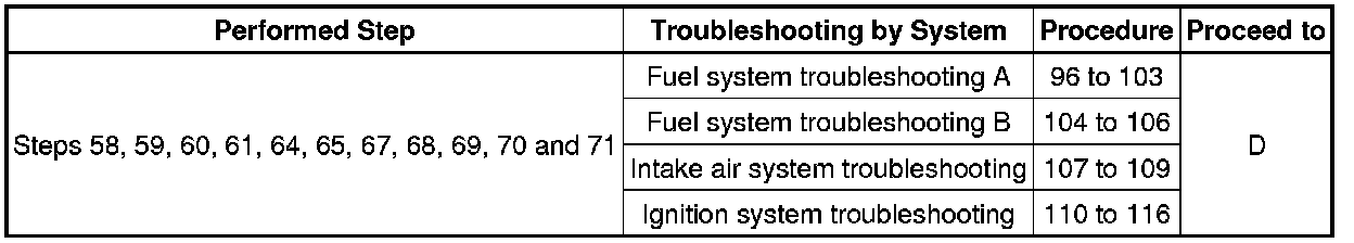 (d) If the malfunction could not be identified during the inspection in steps 58, 59, 60, 61, 64, 65, 67, 68, 69, 70 and 71, perform fuel system troubleshooting A (steps 96 to 103), fuel system troubleshooting B (steps 104 to 106), intake air system troubleshooting (steps 107 to 109), and ignition system troubleshooting (steps 110 to 116), in that order.