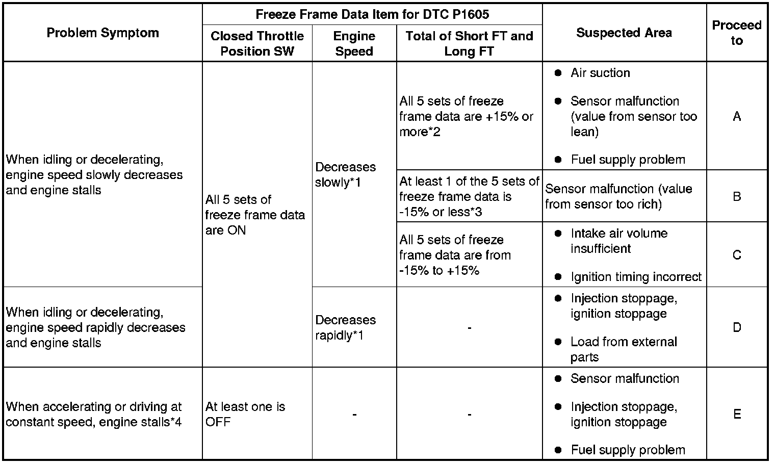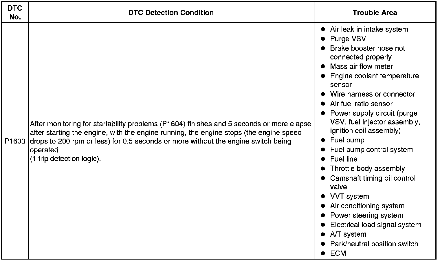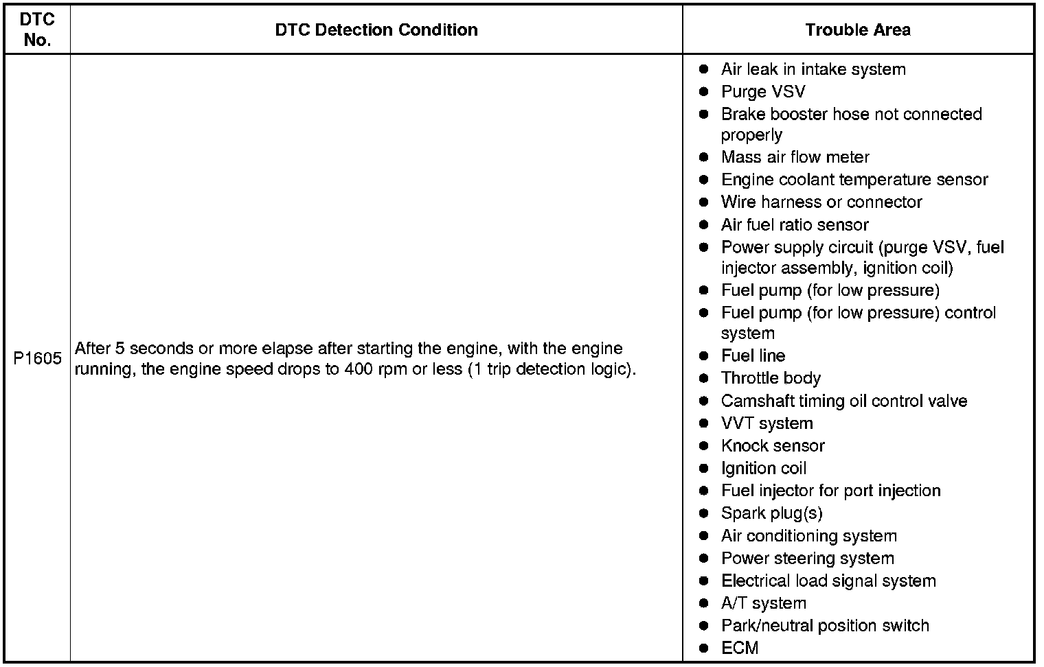 - In contrast to normal malfunction diagnosis for components, circuits and systems, DTCs P1603 and P1605 are used to determine the malfunctioning area from the problem symptoms and freeze frame data when the user mentions problems such as engine stall.