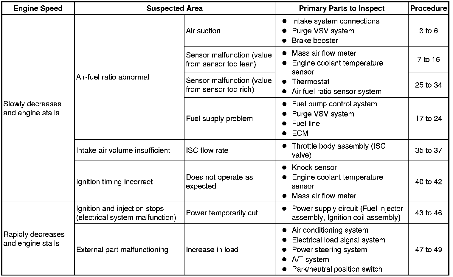 - If the engine stalled when the intake air volume was high (during driving or acceleration), there may be a major malfunction such as continuous misfire due to ignition stoppage, fuel injection stoppage, etc. and the torque drops to zero.