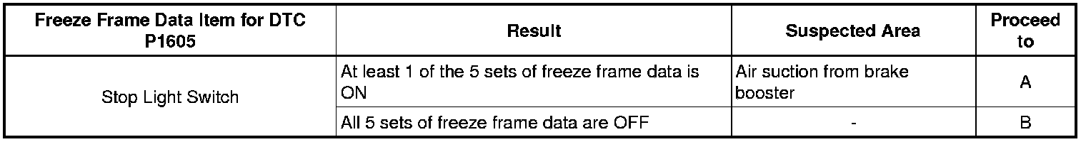 - When DTC P1603 (Engine Stall History) is stored, DTC P1605 (Rough Idling) is also stored. When confirming freeze frame data, check DTC P1605. (The ECM stores DTC P1605 first. Therefore, the 5 sets of freeze frame data can be confirmed through DTC P1605, enabling the technician to obtain more information.)
