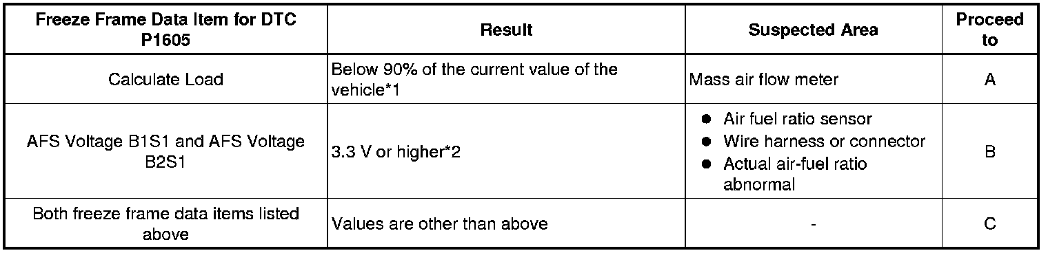 - *1: If the mass air flow meter is malfunctioning and incorrectly measures the pressure to be less than the actual intake manifold pressure, the freeze frame data will show a low engine load value.