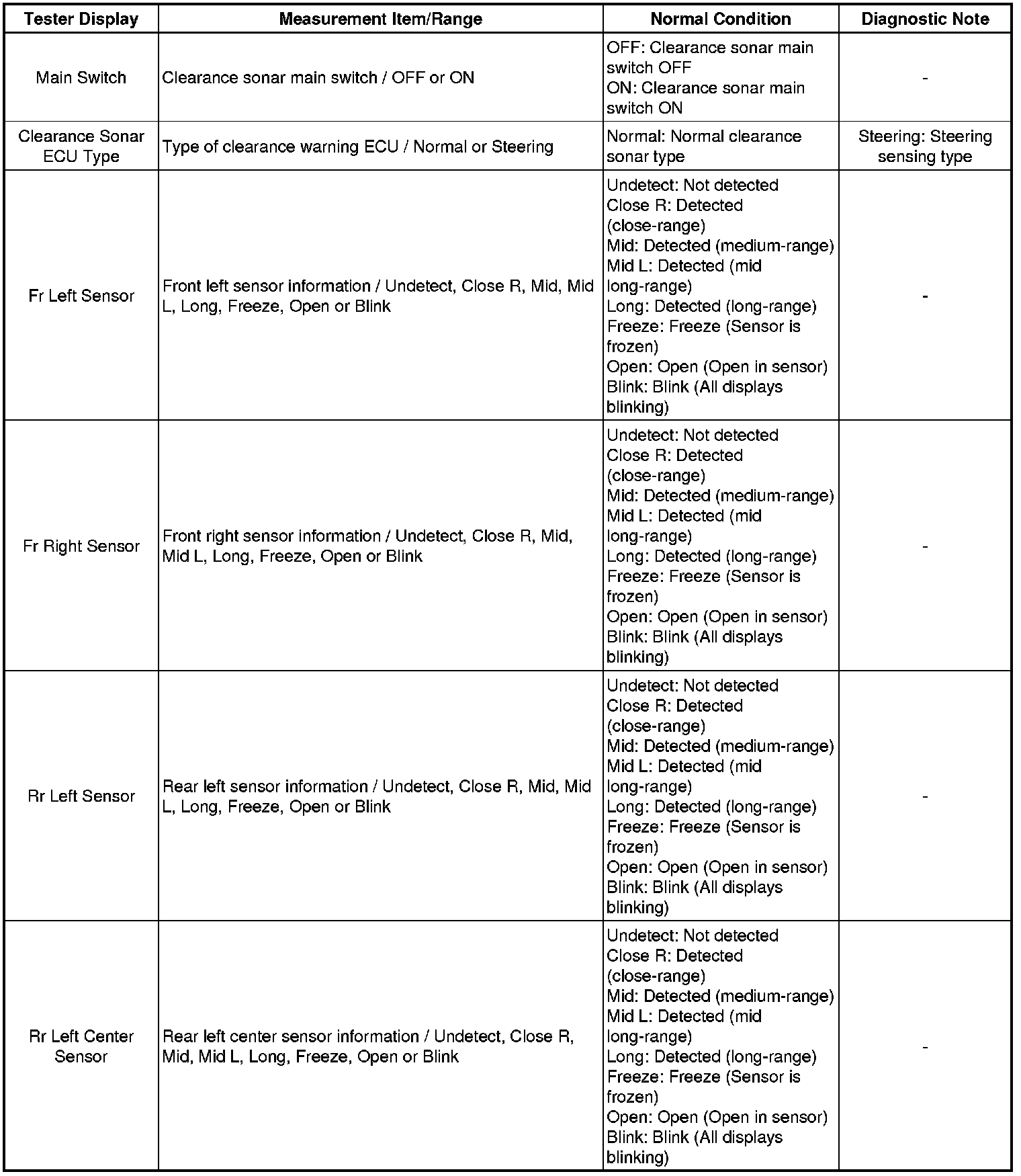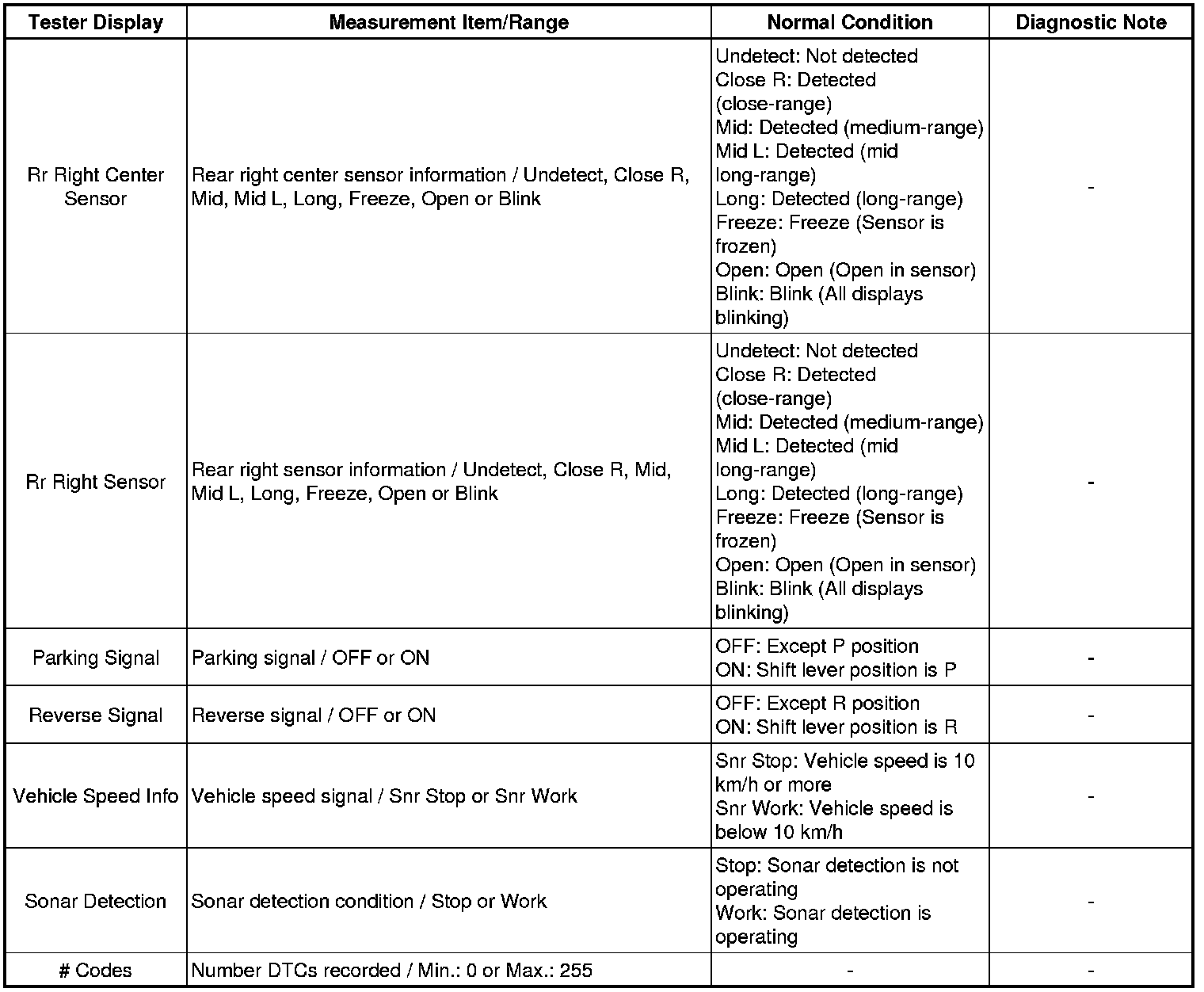 PARK ASSIST / MONITORING: INTUITIVE PARKING ASSIST SYSTEM: DATA LIST / ACTIVE TEST