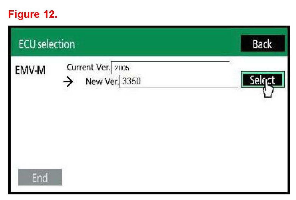 8. When the ECU Selection screen appears, confirm the Current version is less than the New version. If yes, then click the Select button. If no, then click End and go to step 11.