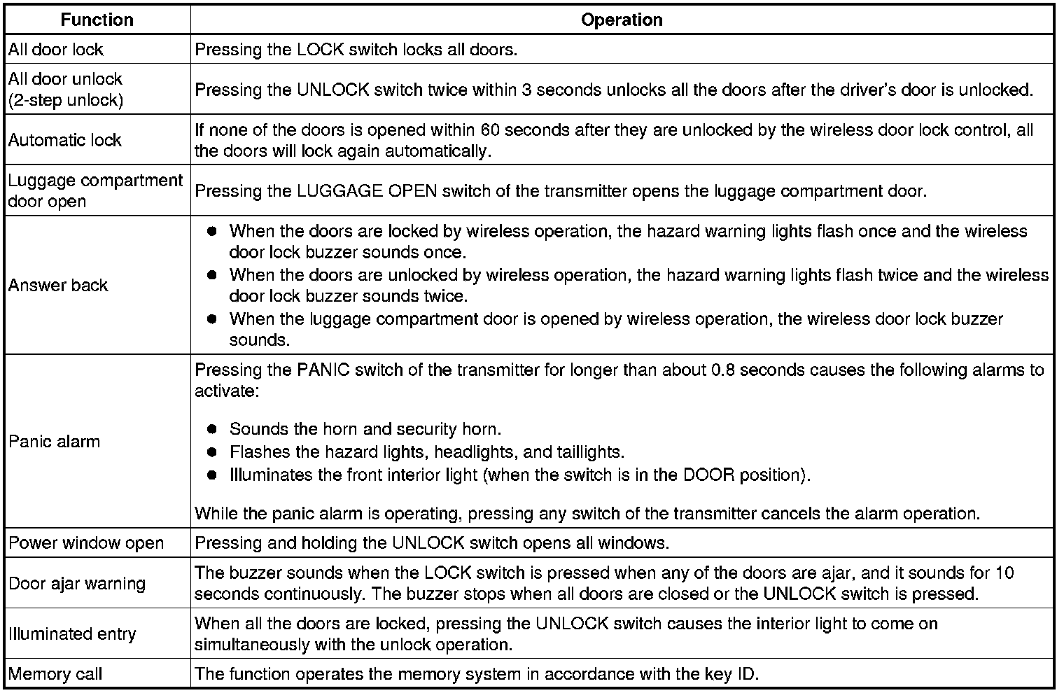 The door control transmitter has the LOCK, UNLOCK, LUGGAGE OPEN, and PANIC switches. Operating these switches activates each function.