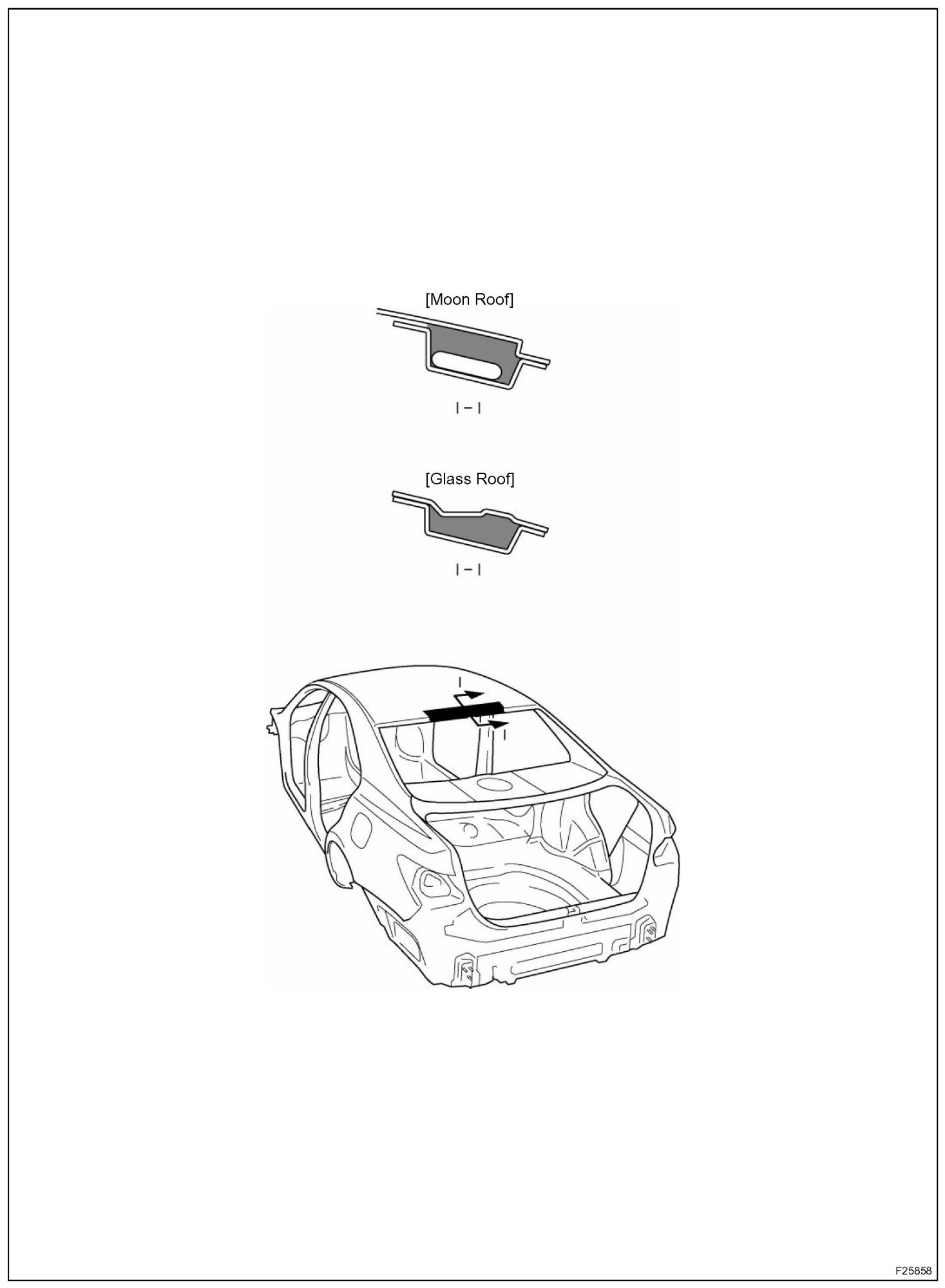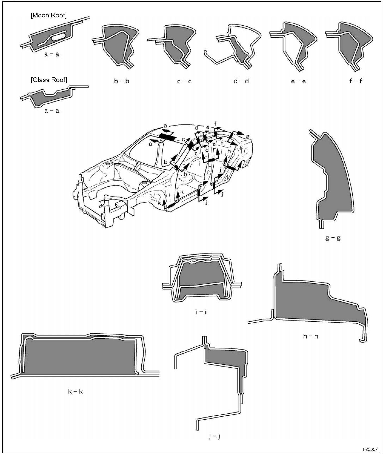 If an increase in temperature or other condition damages the foamed material when repairing or replacing the panel, fill in the insufficient areas with urethane foam. The illustration shows the areas for one side, but the foamed material must be applied equally to both the left and right sides.