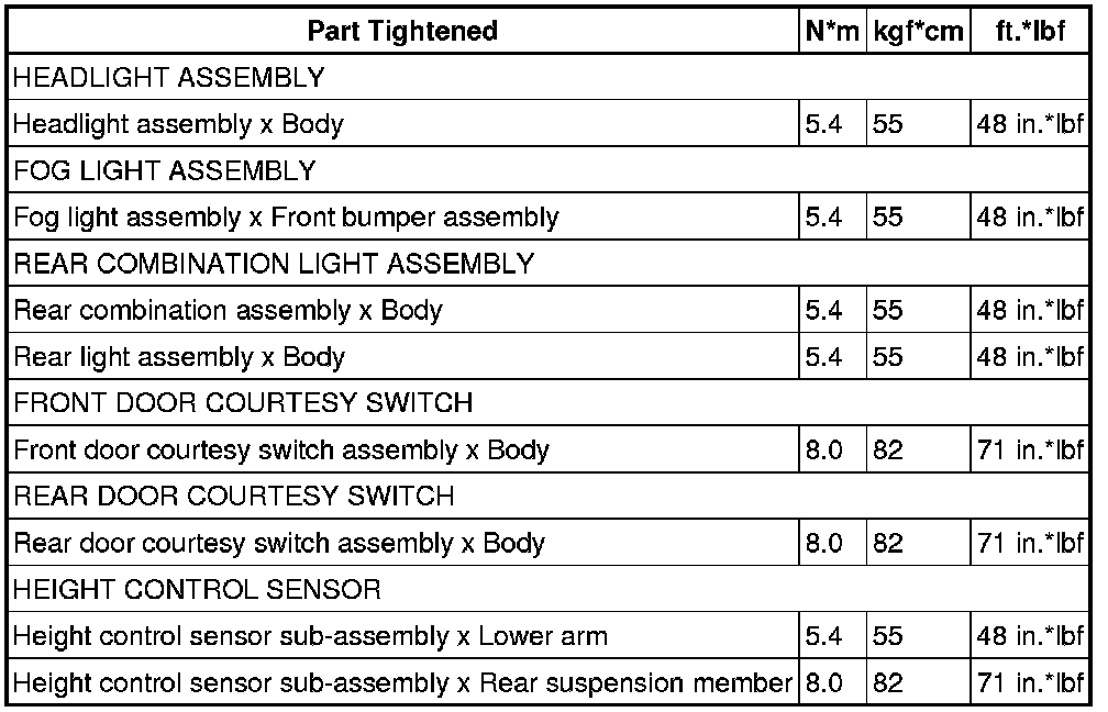 SERVICE SPECIFICATIONS: LIGHTING: TORQUE SPECIFICATIONS