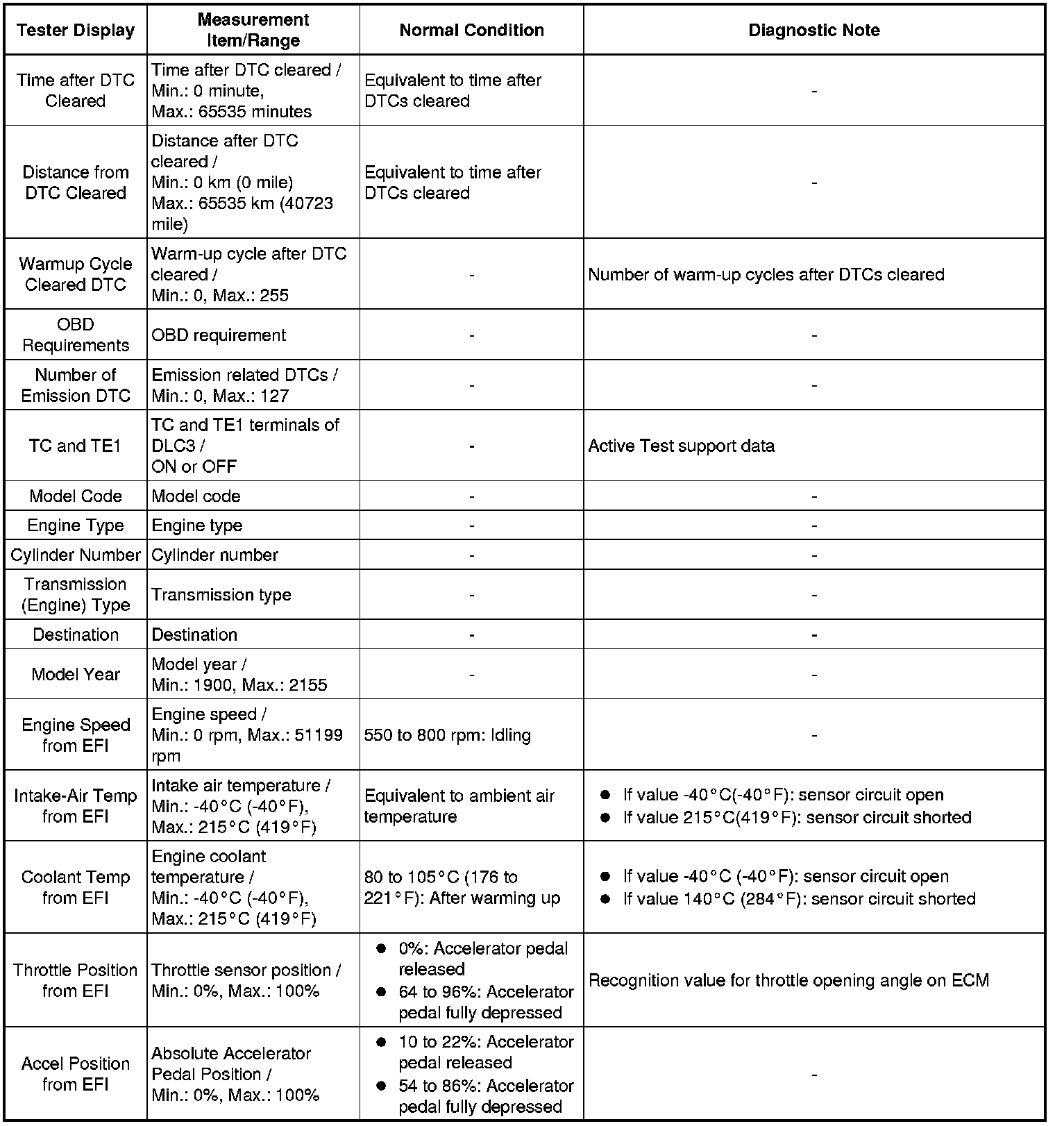 Using Techstream to read the Data List allows the values or states of switches, sensors, actuators and other items to be read without removing any parts. This non-intrusive inspection can be very useful because intermittent conditions or signals may be discovered before parts or wiring is disturbed. Reading the Data List information early in troubleshooting is one way to save diagnostic time.