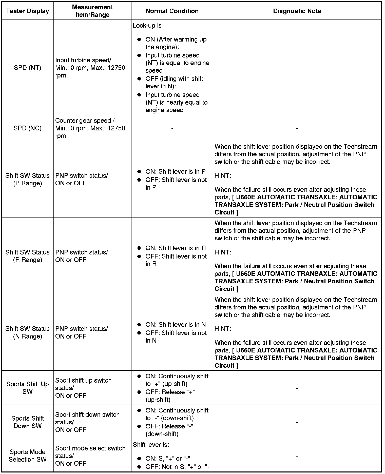 U660E AUTOMATIC TRANSAXLE: AUTOMATIC TRANSAXLE SYSTEM: DATA LIST / ACTIVE TEST
