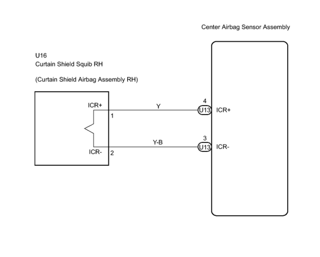 The curtain shield squib RH circuit consists of the center airbag sensor assembly and the curtain shield airbag assembly RH.