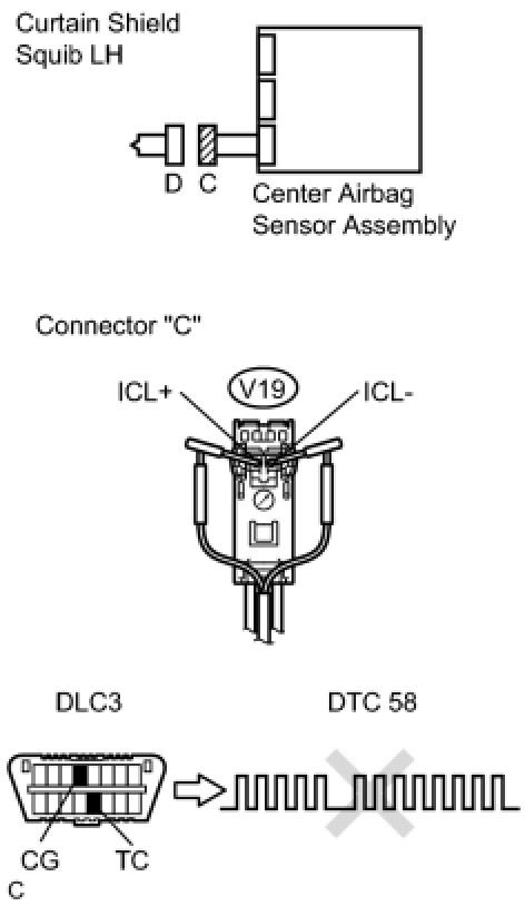 The curtain shield squib LH circuit consists of the center airbag sensor assembly and the curtain shield airbag assembly LH.