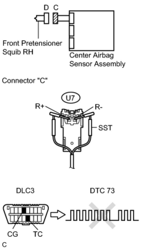 The front pretensioner squib RH circuit consists of the center airbag sensor assembly and the front seat outer belt assembly RH.