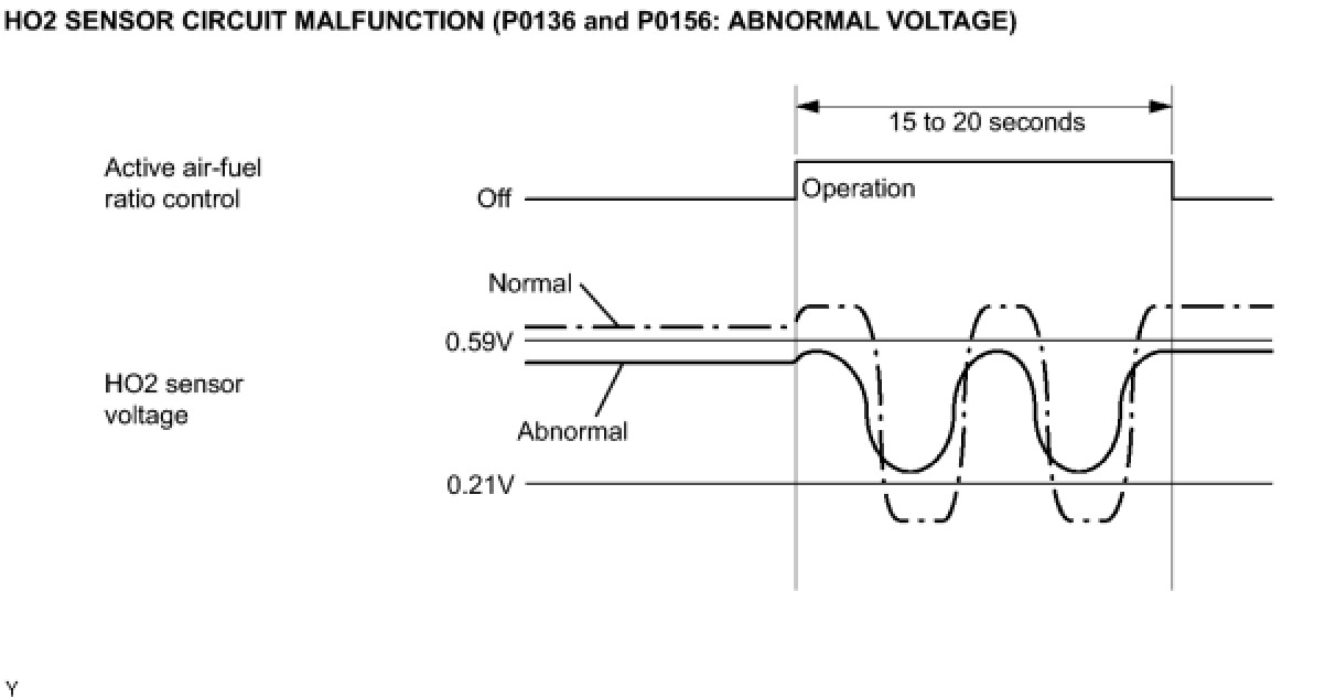 While the ECM is performing active air fuel ratio control, the air fuel ratio is forcibly regulated to become rich or lean. If the sensor is not functioning properly, the voltage output variation is small. For example, when the HO2 sensor voltage does not decrease to less than 0.21 V or does not increase to more than 0.59 V during active air fuel ratio control, the ECM determines that the sensor voltage output is abnormal and sets DTCs P0136 and P0156.