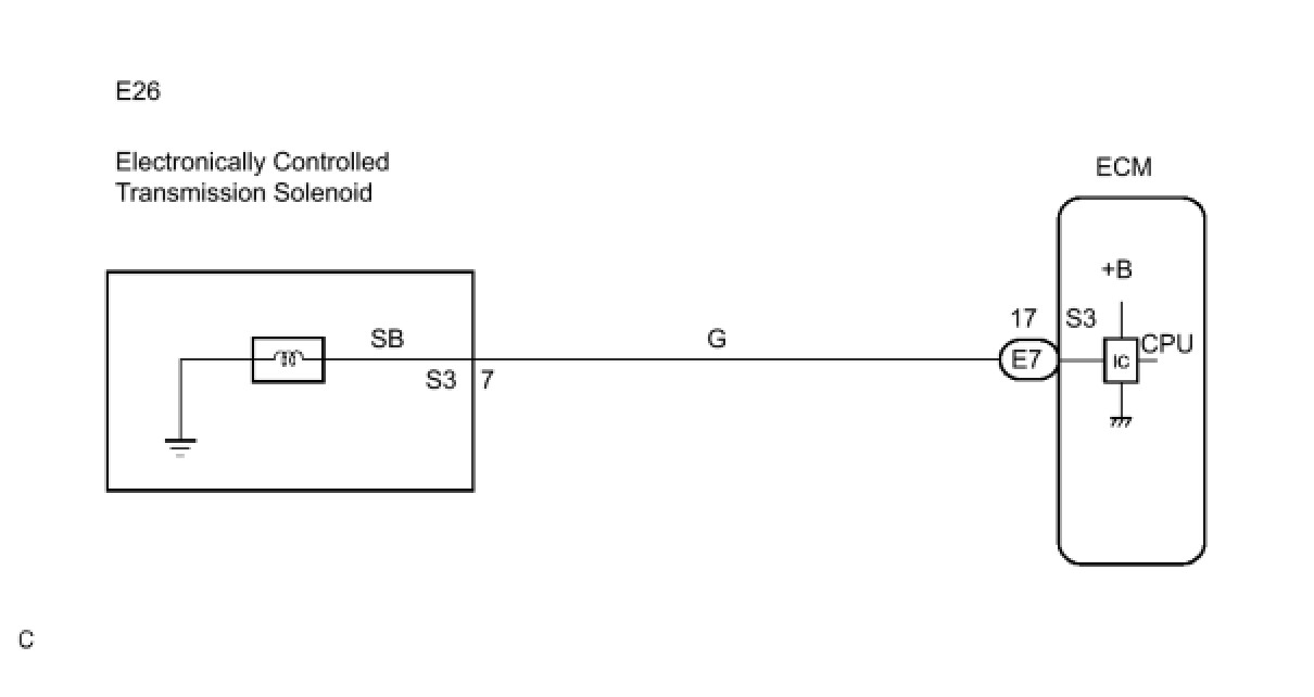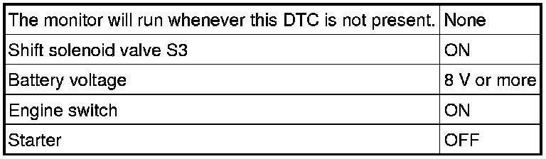 These DTCs indicate an open or short in the shift solenoid valve S3 circuit. When there is an open or short circuit in any shift solenoid valve circuit, the ECM detects the problem and illuminates the MIL and stores the DTC. When the shift solenoid valve S3 is on, if resistance is 8 Ohms or less, the ECM determines there is a short in the shift solenoid valve S3 circuit.
