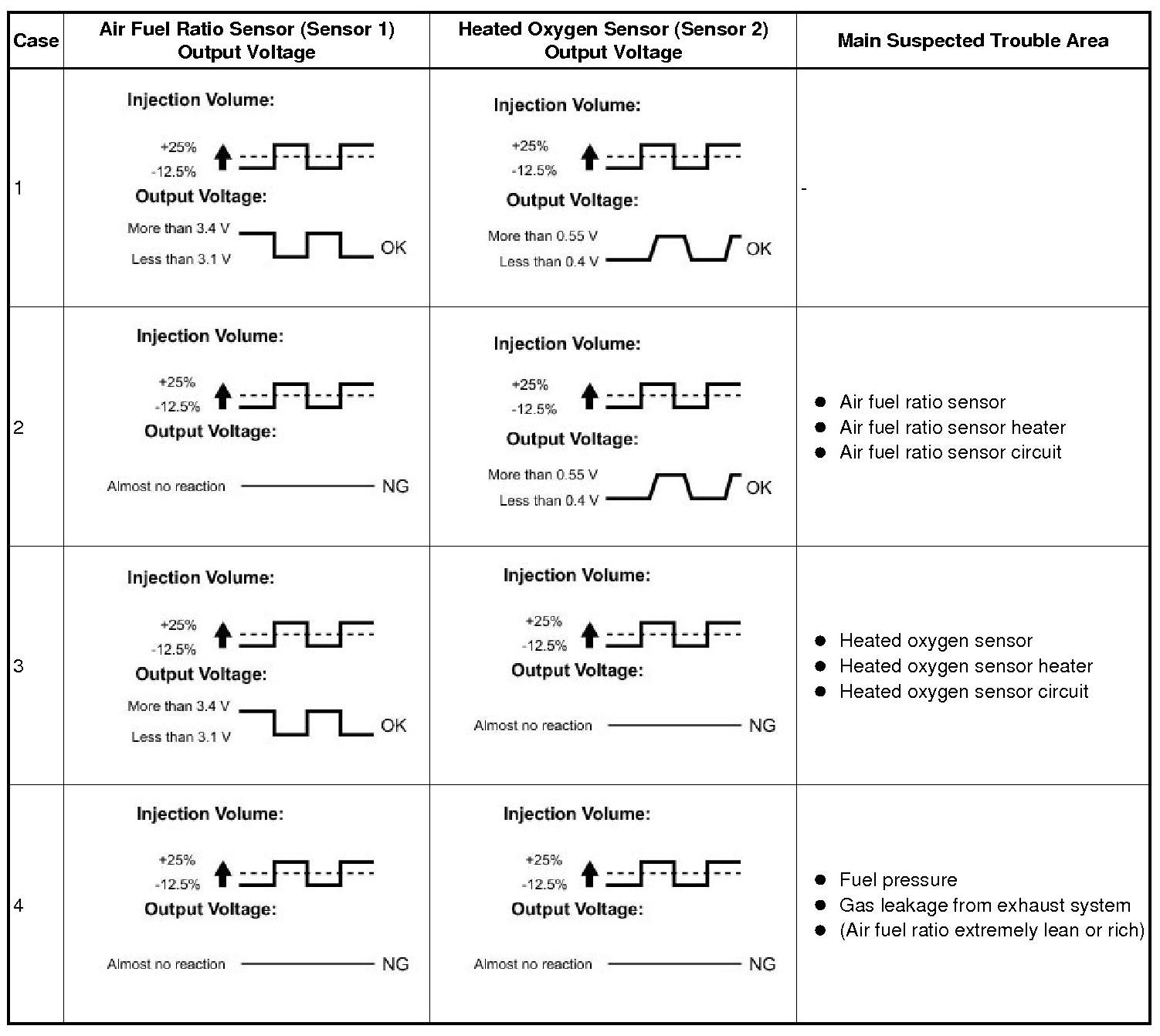 Malfunctioning areas can be identified by performing the Control the Injection Volume for A/F Sensor function provided in the Active Test. The Control the Injection Volume for A/F Sensor function can help to determine whether the Air-fuel Ratio (A/F) sensor, Heated Oxygen (HO2) sensor and other potential trouble areas are malfunctioning.