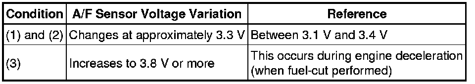 - The ECM stops fuel injection (fuel cut) during engine deceleration. This causes a lean condition and results in a momentary increase in the A/F sensor output voltage.