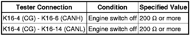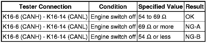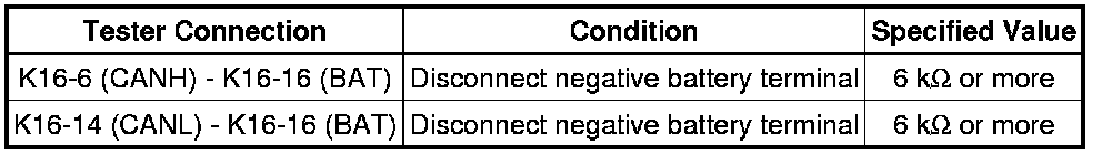 When any DTC for the CAN communication system is output, first measure the resistance between the terminals of the DLC3 to specify the trouble area, and check that there is no short in the CAN main bus line, between the CAN bus lines, to +B, or to GND.