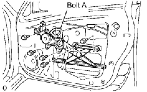 (d) Install the window regulator with the 5 bolts and tighten the bolt labeled A.