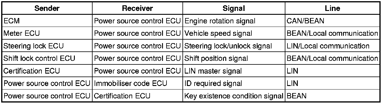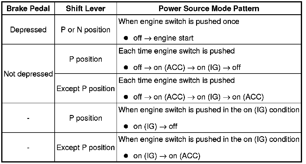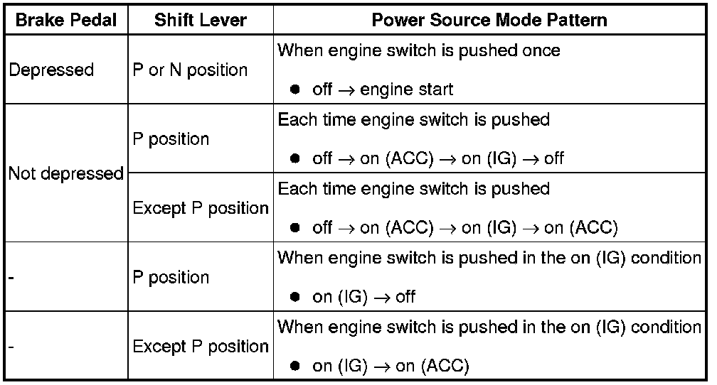 (a) The push-button start uses a push-type engine switch, which the driver can operate by merely carrying the key. This system consists primarily of the power source control ECU, engine switch, ID code box, steering lock ECU, key, ACC relay, IG1 relay, IG2 relay and certification ECU. The power source control ECU controls the system. This function operates in cooperation with the smart access system with push-button start. The table below shows the transition of the engine switch, which depends on whether the brake pedal is depressed or released.