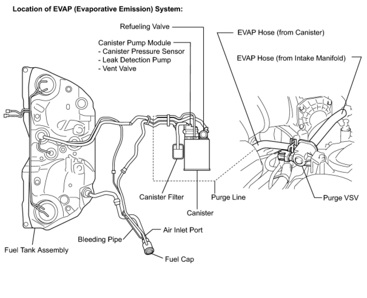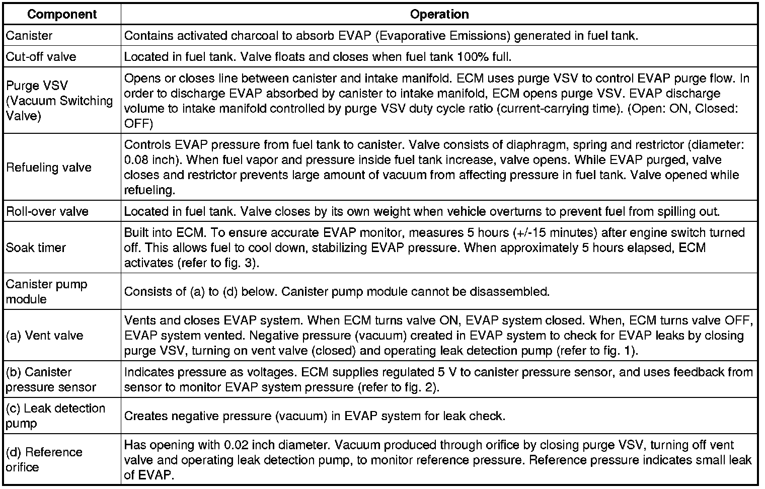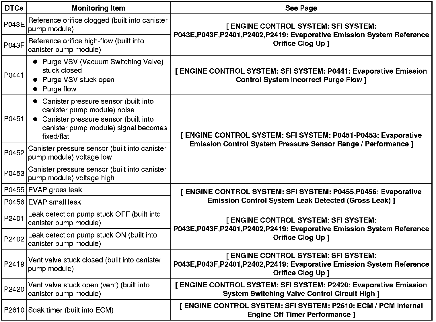 The leak detection pump creates negative pressure (vacuum) in the EVAP system and the pressure is measured. Finally, the ECM monitors for leaks from the EVAP system, and malfunctions in both the canister pump module and purge VSV, based on the EVAP pressure.