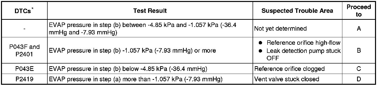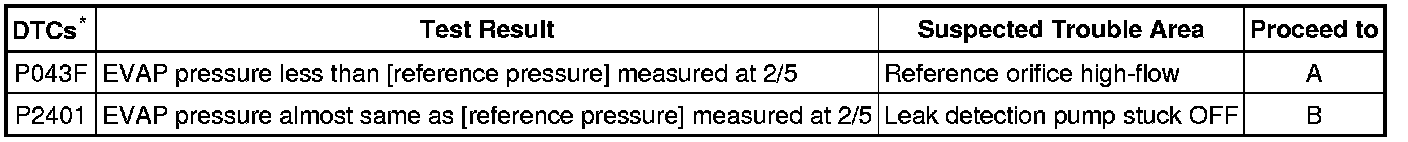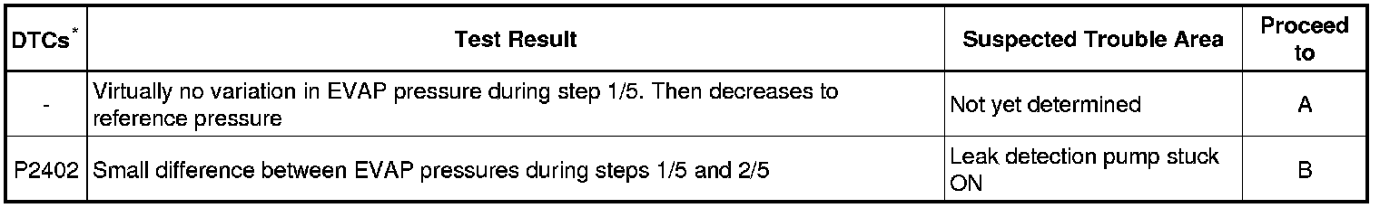 If the reference pressure difference between the first and second checks is greater than the specification, all the DTCs relating to the reference pressure (P043E, P043F, P2401, P2402 and P2419) are stored.