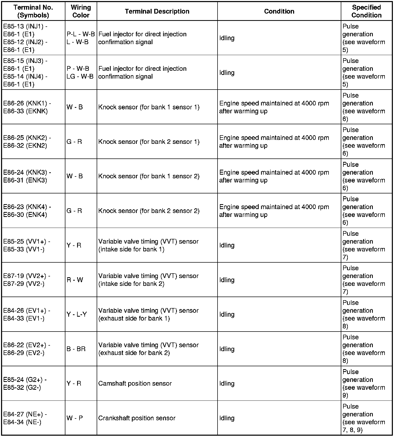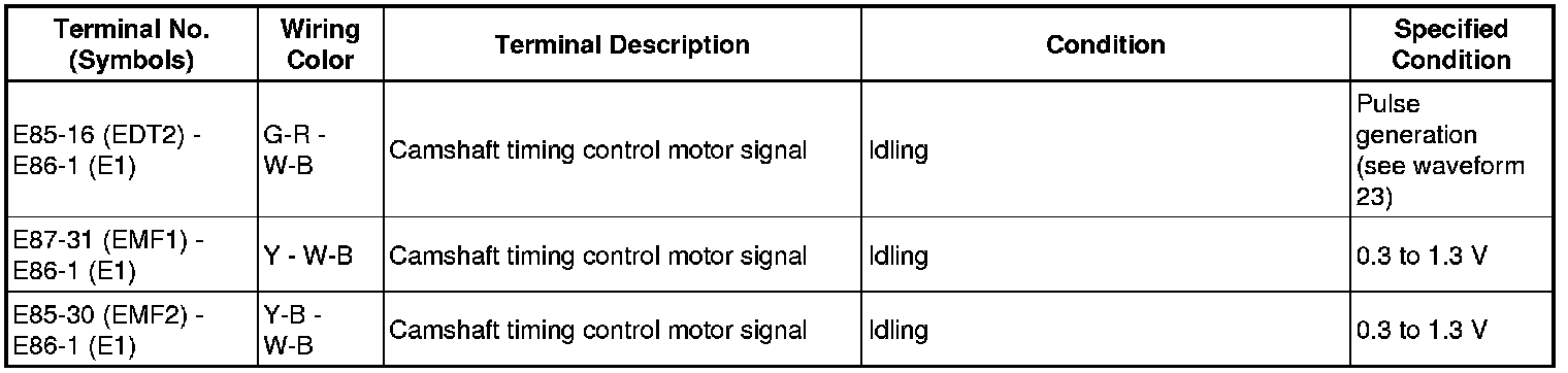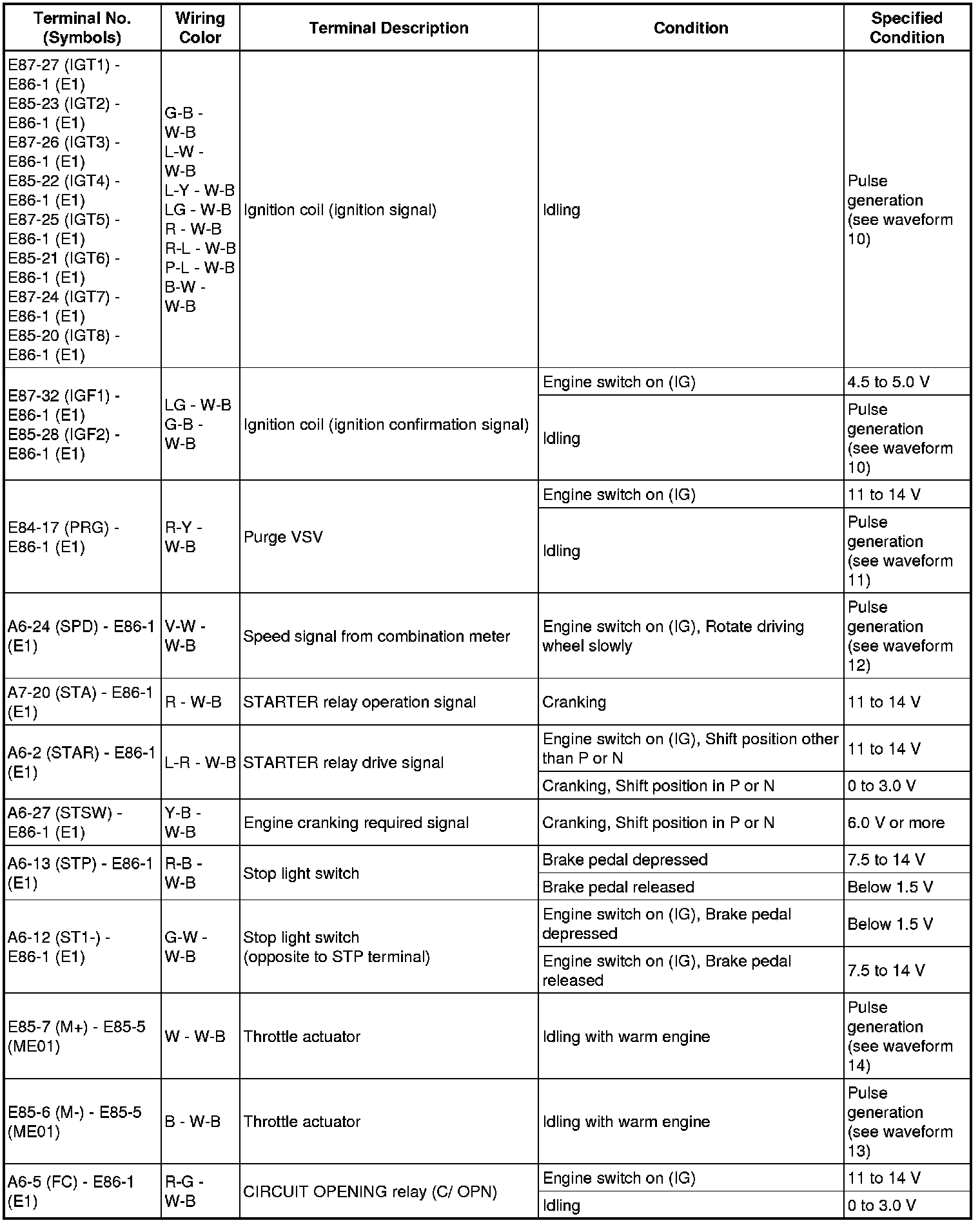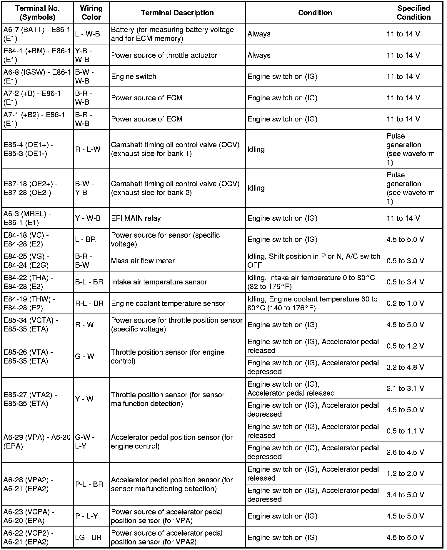 The standard normal voltage between each pair of the ECM terminals is shown in the table below. The appropriate conditions for checking each pair of the terminals are also indicated. The result of checks should be compared with the standard normal voltage for that pair of terminals, displayed in the Specified Condition column. The illustration above can be used as a reference to identify the ECM terminal locations.