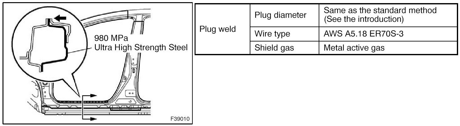 NOTICE: Be sure to use Metal active gas (Ar 80% + CO2 20%) as the shield gas when plug welding. Sufficient weld strength cannot be assured when using 100% CO2 shield gas.