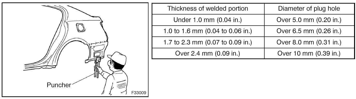 1. For areas where a spot welder cannot be used, use a puncher or drill to make holes for plug welding.