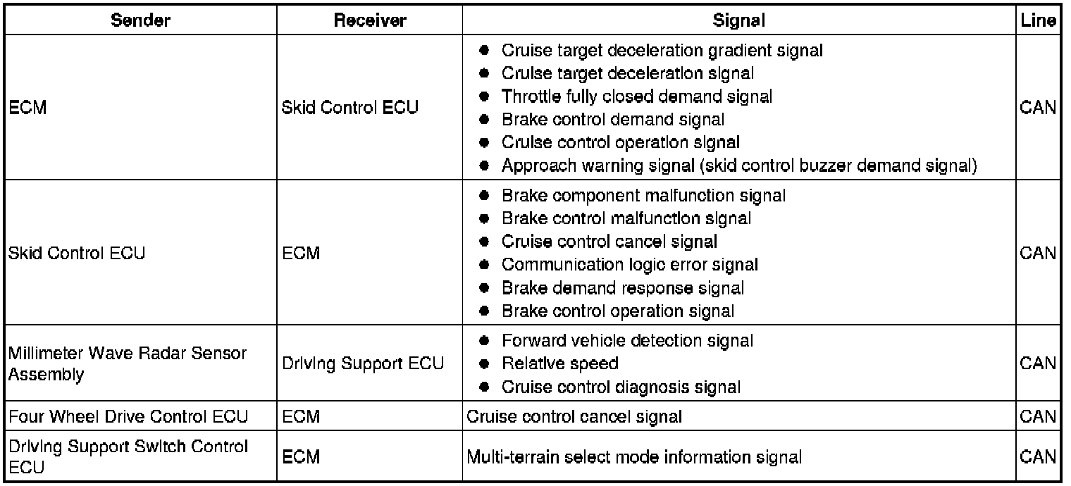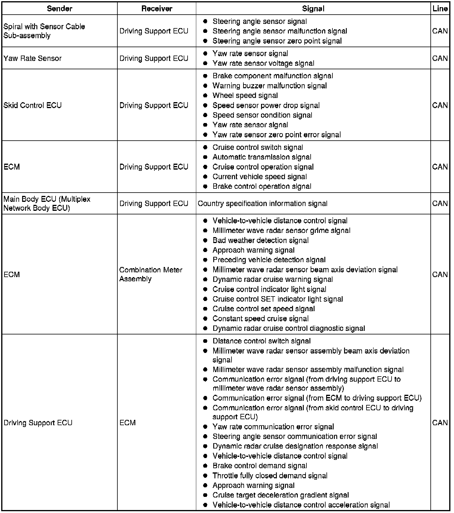 The driving support ECU determines the distance to the vehicle in front, relative speed, target decreasing speed and deceleration rate. Based on this data, the ECU may transmit a brake demand signal to the skid control ECU.