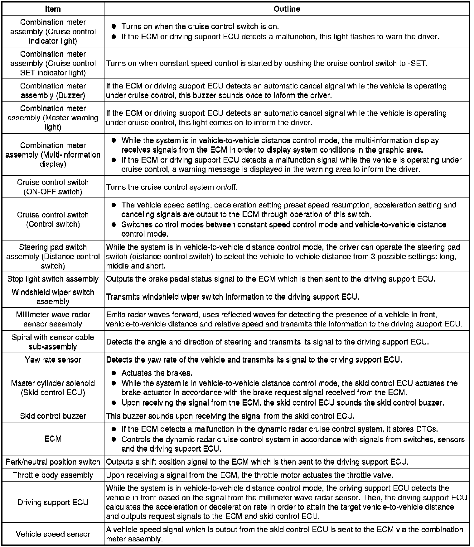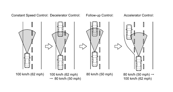 The cruise control switch operates 8 functions: SET, COAST, TAP-DOWN, RESUME, ACCEL, TAP-UP, CANCEL and MODE. The SET, TAP-DOWN and COAST functions and the RESUME, TAP-UP and ACCEL functions are operated with the same switch. The cruise control switch is an automatic return type switch which turns on only while pushing it in each arrow direction and turns off after releasing it. The dynamic radar cruise control system has two cruise control modes: constant speed control mode and vehicle-to-vehicle distance control mode.