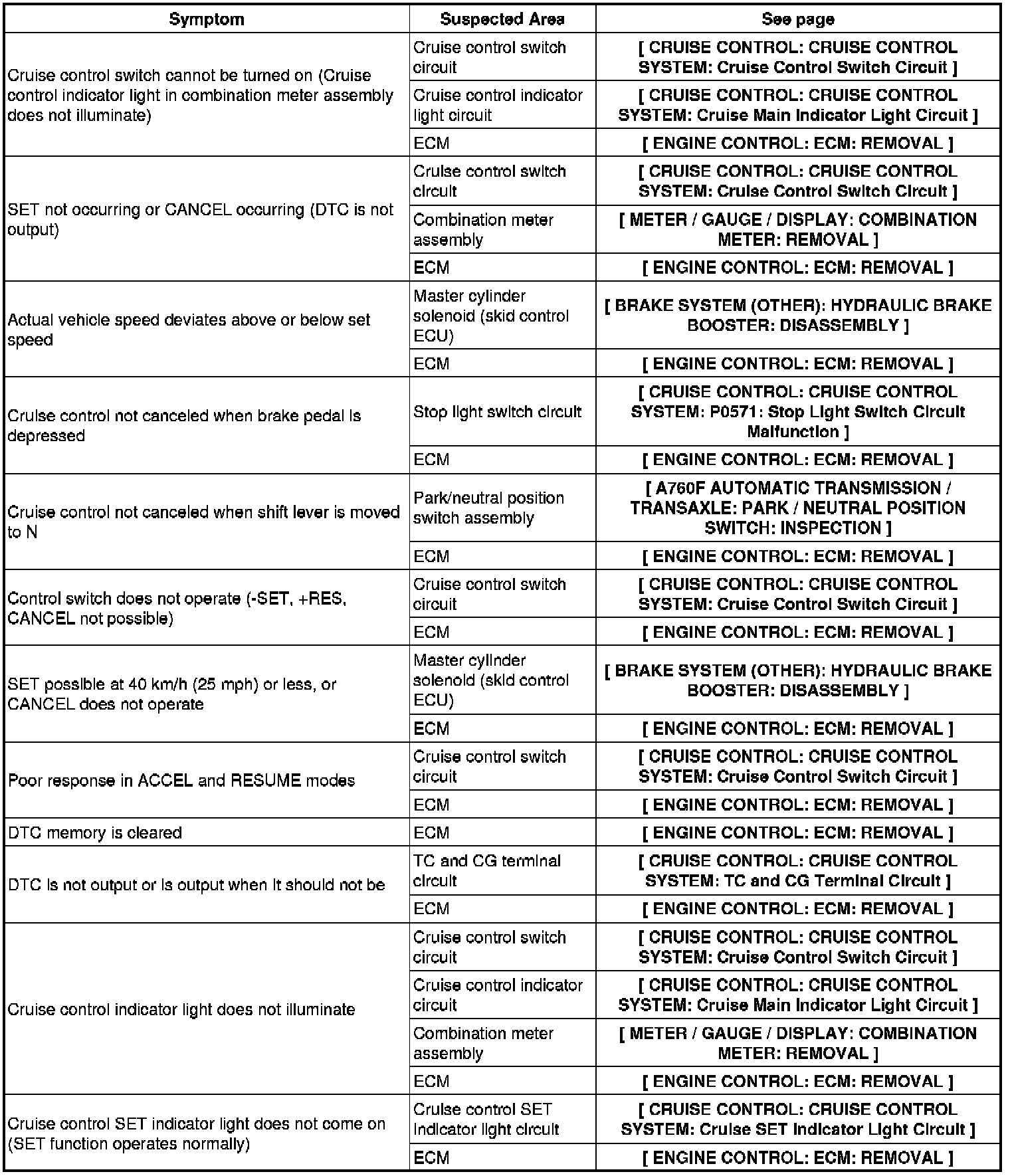 CRUISE CONTROL: CRUISE CONTROL SYSTEM: PROBLEM SYMPTOMS TABLE