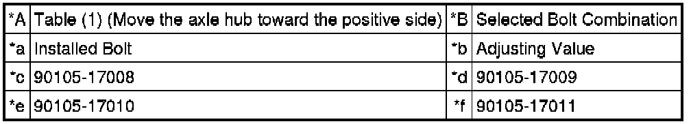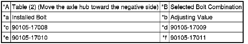 Check the combination of the installed bolts. Select appropriate bolts from the tables below to adjust the camber to the specified values.