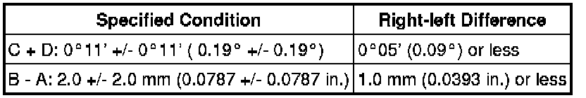 Camber is not adjustable. If the measurement is not within the specified range, inspect the suspension parts for damage and/or wear, and replace them if necessary.